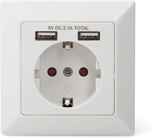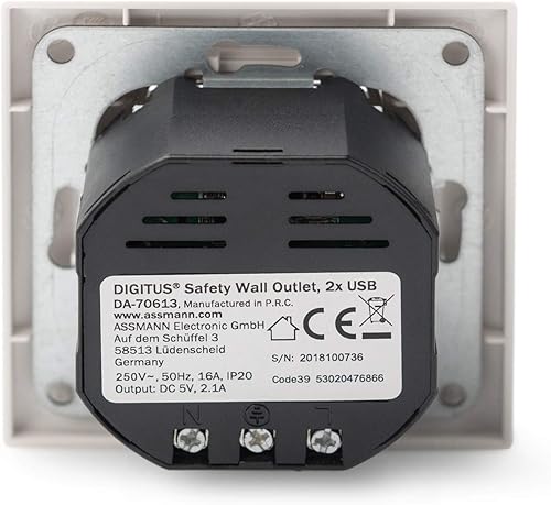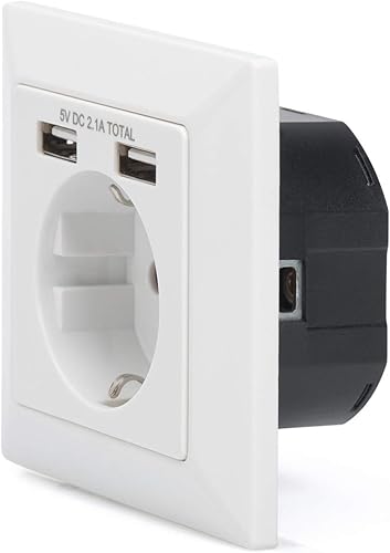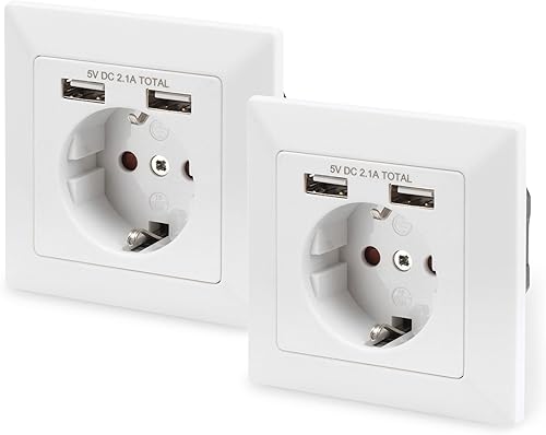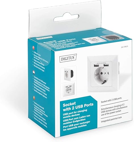 DIGITUS - Presa con contatto di protezione, 2 USB, USB Ges. Potenza 5 V 2,1 A, ingresso: AC 250 V 50 Hz, RAL 9003 bianco., (DA-70613)