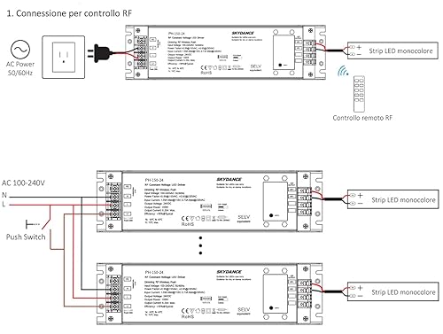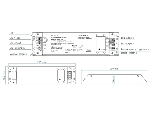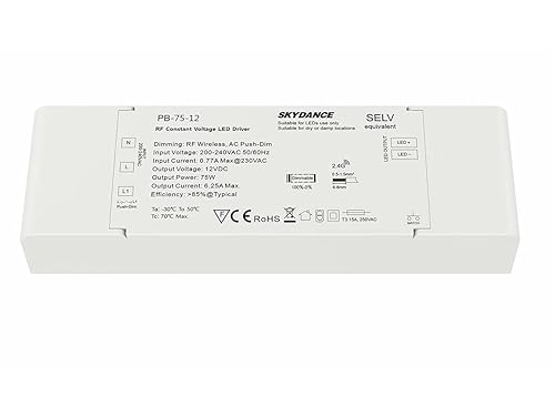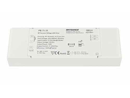 Trasformatore Alimentatore Dimmerabile 24V 75W con Pulsante N.O. Push Dimmer – Compatibile con Telecomando RF 2.4G (non incluso), Per Striscia LED 24V, Skydance PB-75-24