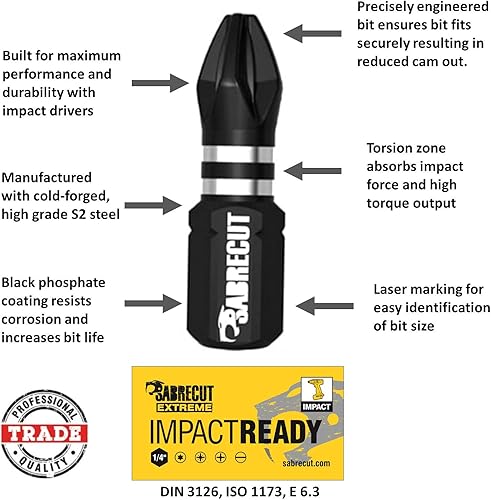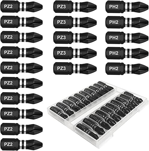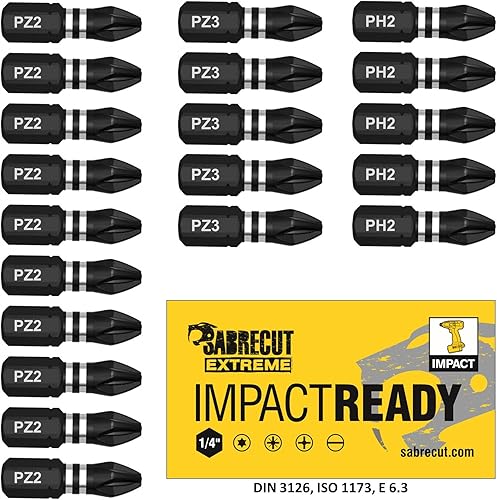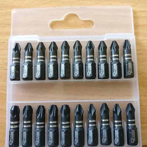 20 punte per cacciavite a percussione SabreCut SCPB25_20 da 25 mm PZ2 PZ3 PH2 a un'estremità PoziDriv POZI n. 2 n. 3 Phillips n. 2 per impieghi gravosi con scatola di immagazzinaggio