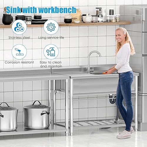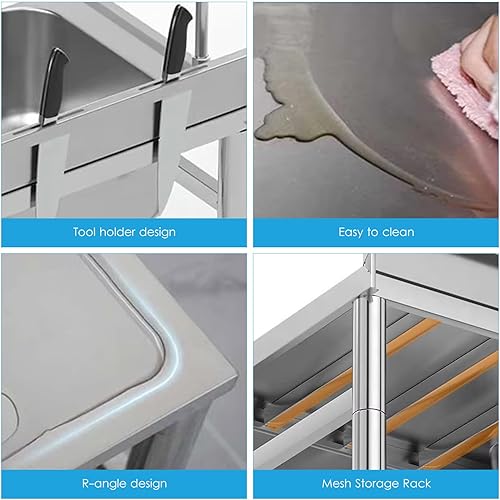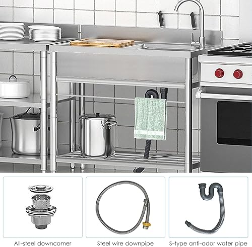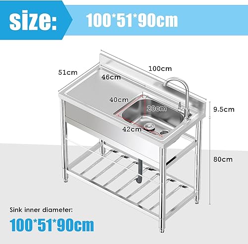 Acciaio Inox Professionale Lavello da Cucina Commerciale con Piattaforme di Lavoro e Rubinetto, Lavello da Esterno Autoportante con Ripiano di Stoccaggio per Garage, Lavanderia, 100 x 50 x 90 cm