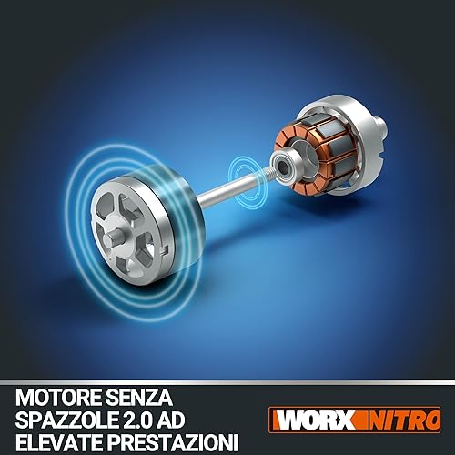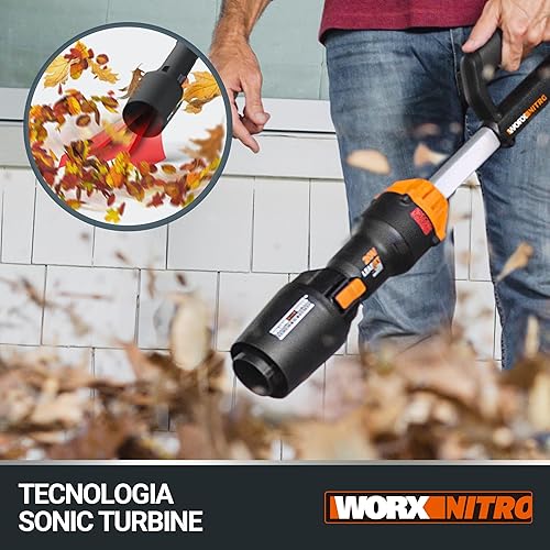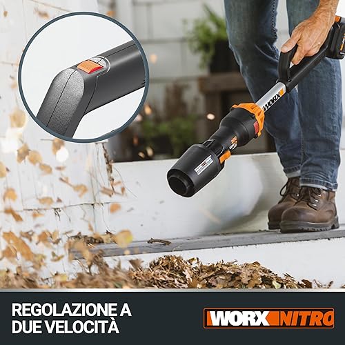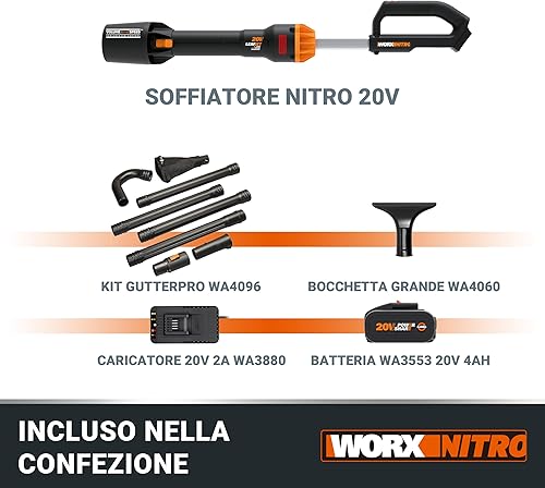 WORX Nitro WG543E.1 - Soffiatore professionale a batteria, 20 V, motore brushless 2.0, max. 209 km/h, 2 livelli di velocità, con batteria PowerShare da 4,0 Ah, caricatore e kit per grondaie GUTTERPRO