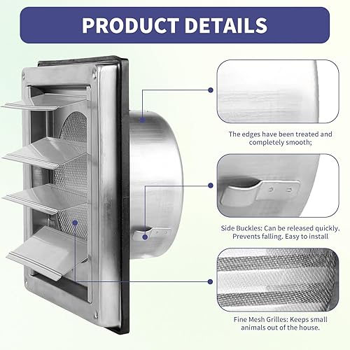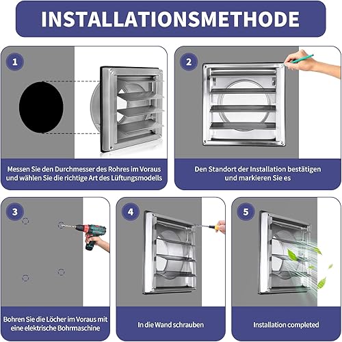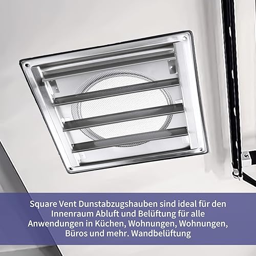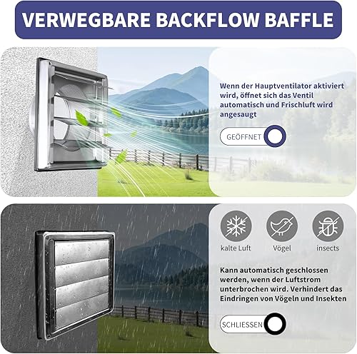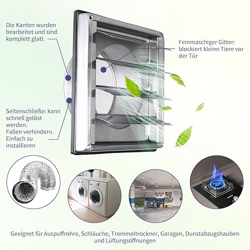 Griglia di ventilazione 150 mm in acciaio inox con griglia di protezione dagli insetti e valvola di ritorno, lamelle per montaggio a parete esterna di impianti di ventilazione e cappe con guarnizione