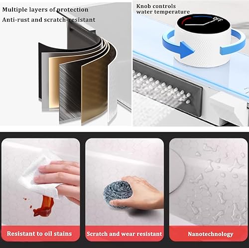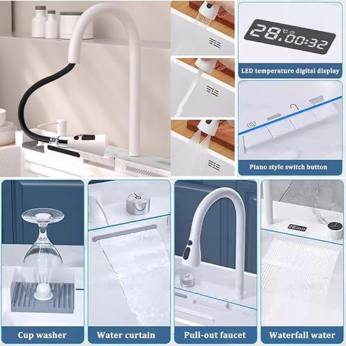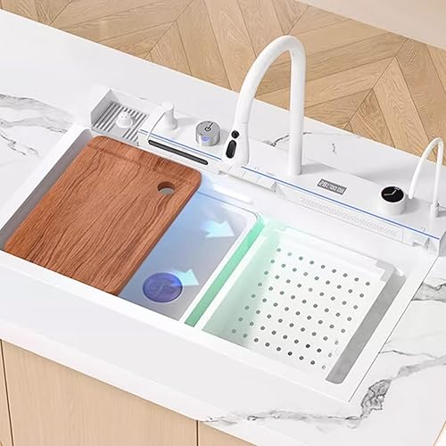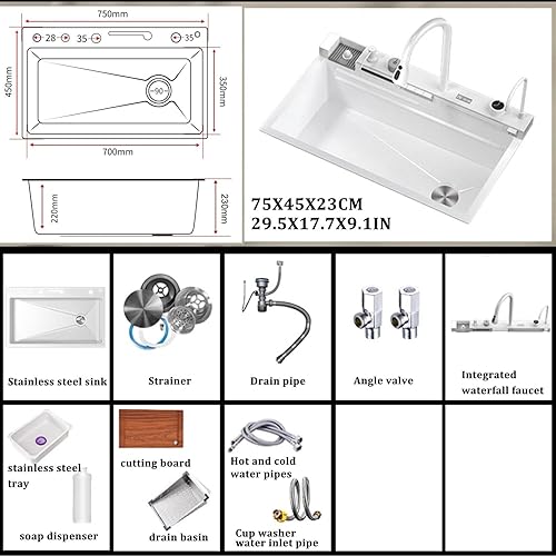 Lavello da cucina in acciaio inossidabile, bianco, grande, monovasca, con rubinetto a cascata digitale multifunzione e accessori (75 x 45 x 23 cm)
