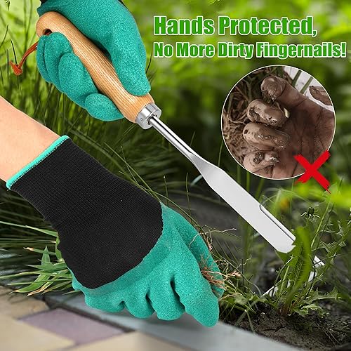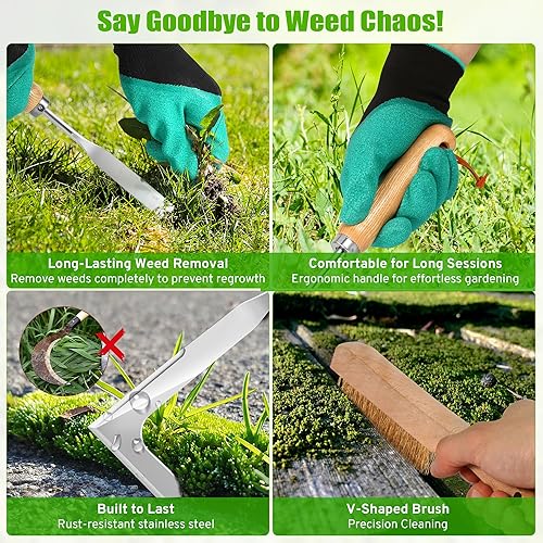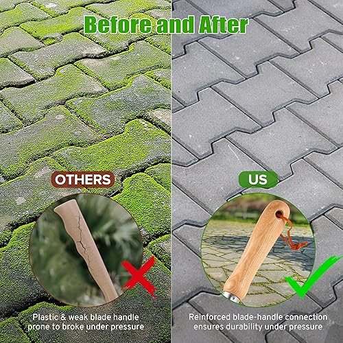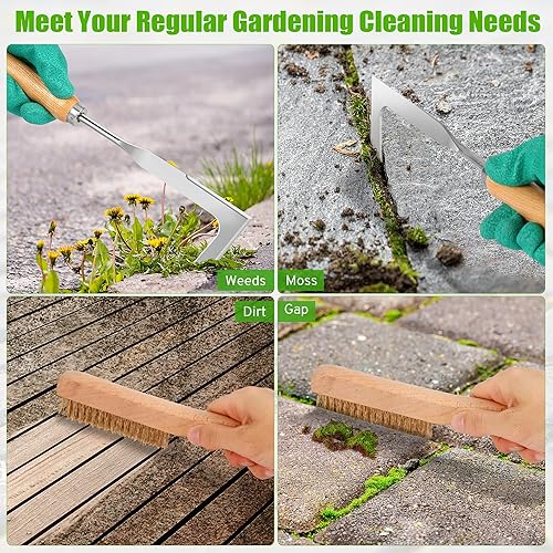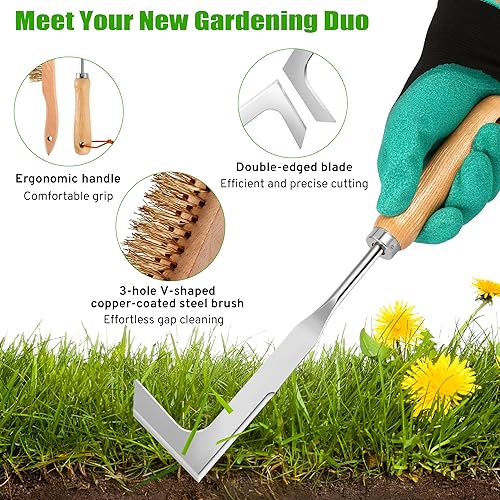 2pcs Estirpatore Erbacce Manuale con Guanti - Raschietto e Spazzola per Erbacce con Manico Ergonomico Legno e Attacco Lama Rinforzato, Attrezzi da Giardino per Cortili, Vialetti