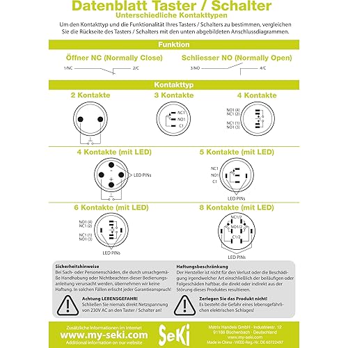 SeKi Pulsante a pressione in acciaio inox, Ø 16 mm, a forma di testa sporgente, attacco a vite; pulsante campanello