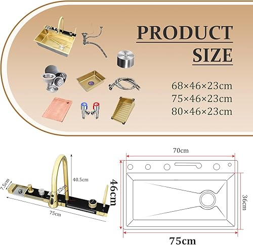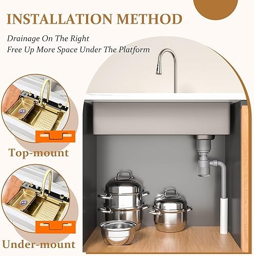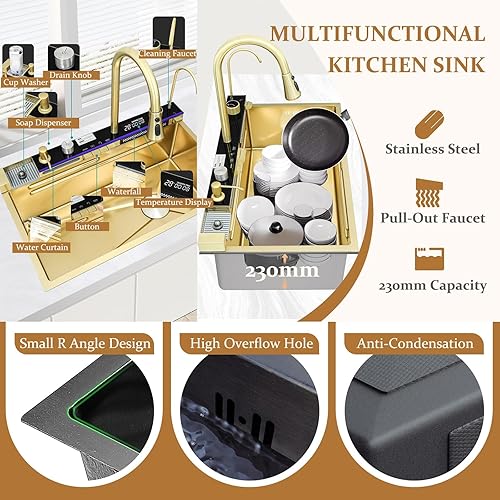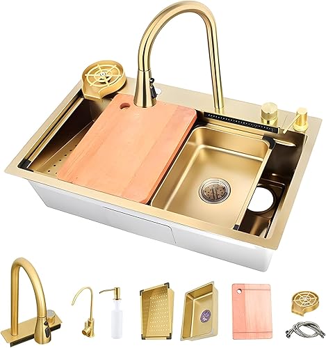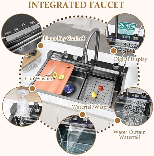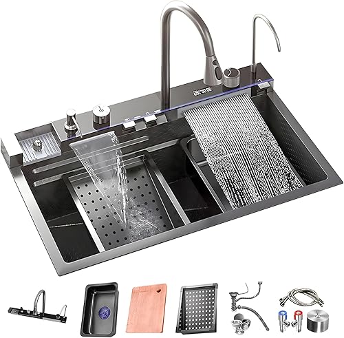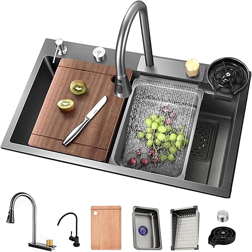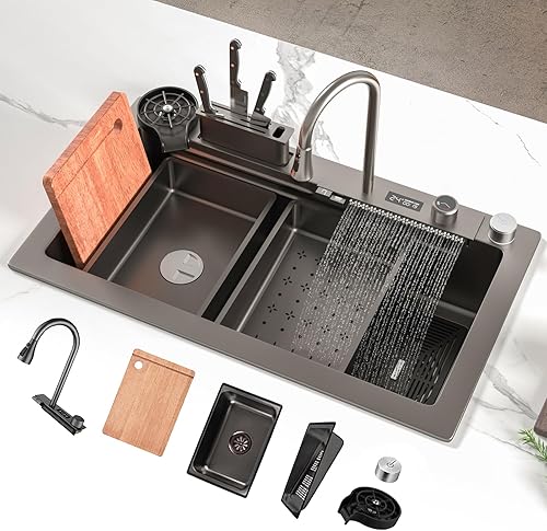 Lavello da incasso in acciaio inox, 1 vasca, 85 x 50 cm, colore nero, grigio, con design a cascata, rubinetto estraibile, stazione di lavoro e scolapiatti