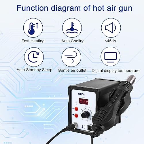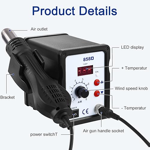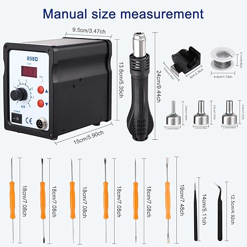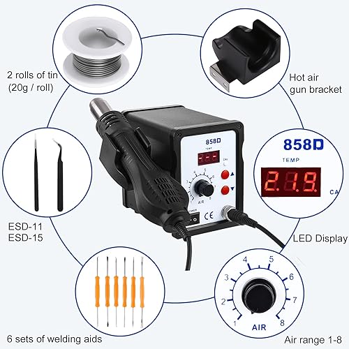 700W stazione saldante aria calda,Rework Station con Display LED 100-480°C,Stazione Saldante Aria Calda con 3 punte,2 rotoli di filo di saldatura,2 pinzette e un kit di strumenti.