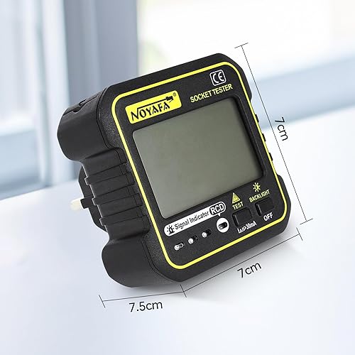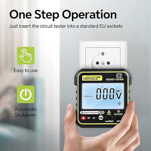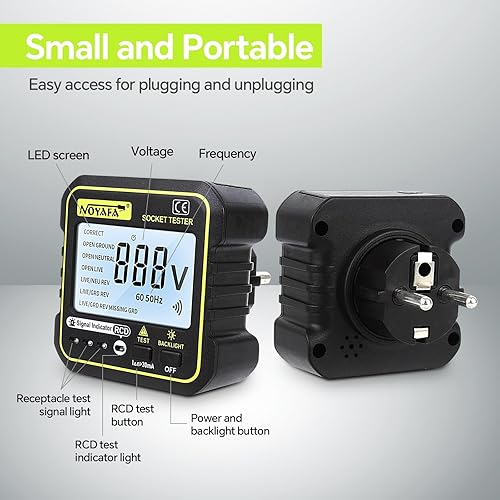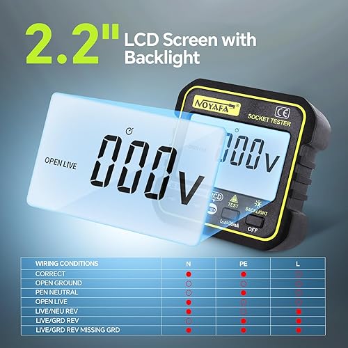 NOYAFA Tester di Presa con test RCD e Display LCD Della Tensione, 6 tipi di diagnosi dei guasti, visualizzazione della tensione e della corrente di dispersione, test RCD, 90-250V/50-60Hz
