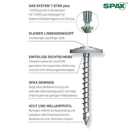 4587000450456 - Vite per spengler, 4,5 x 45 mm, filettatura completa, testa svasata, T-STAR plus T20, 4CUT, acciaio inox A2, disco di tenuta 15 mm