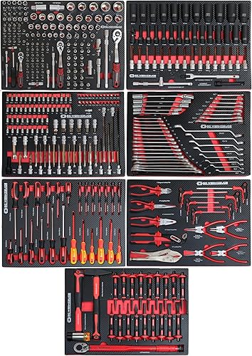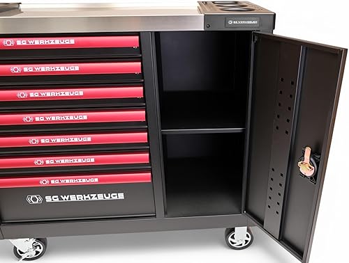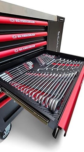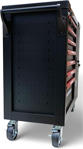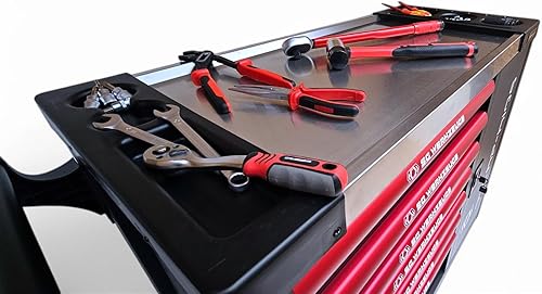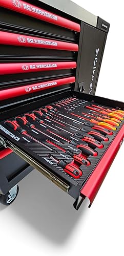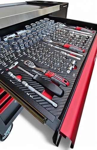 DeTec. Carrello portautensili XXL riempito con attrezzi, 7 cassetti riempiti | carrello da officina auto effetto carbonio | cassetta degli attrezzi per auto Red Black Edition