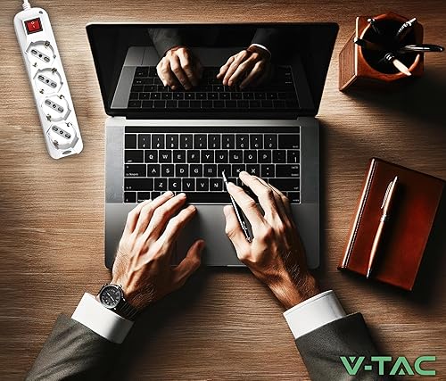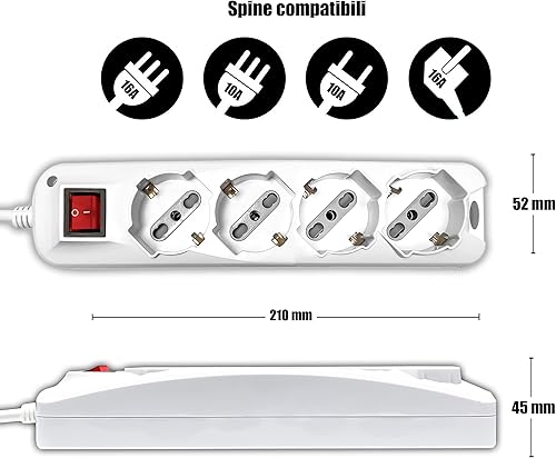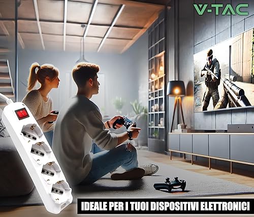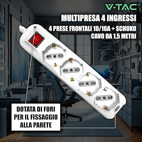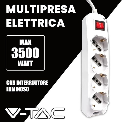 V-TAC Multipresa Elettrica con Interruttore e Cavo da 1,5 Metri - 4 Prese 10/16A Bipasso + Schuko - Spina 16A - Ciabatta Presa Elettrica per Casa, Ufficio, Negozio - Colore Bianco
