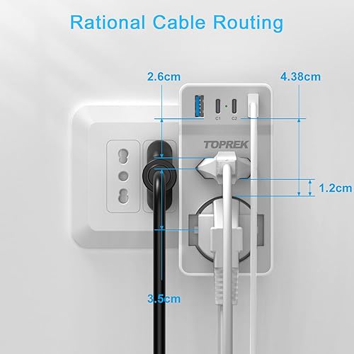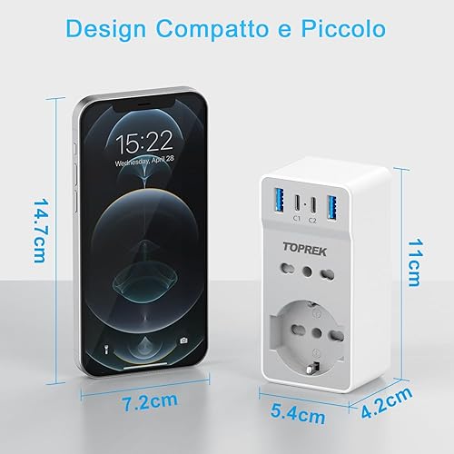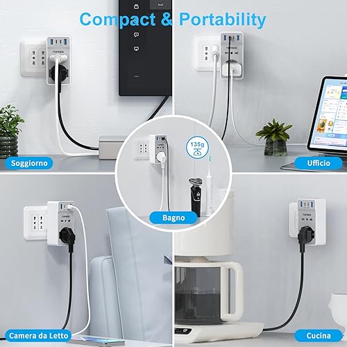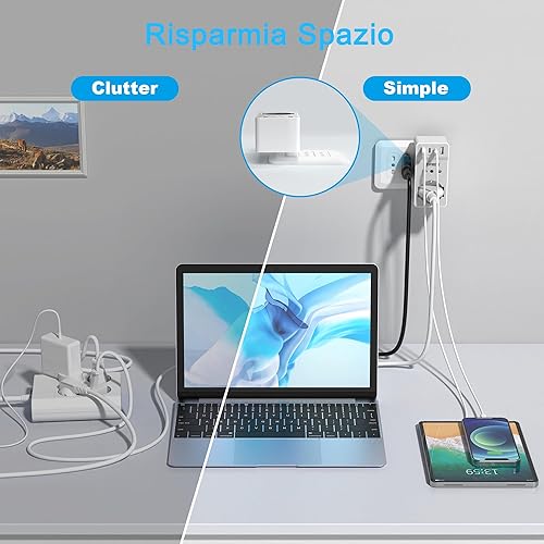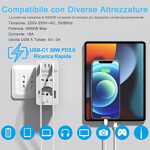 Presa Multipla USB Salvaspazio con 4 USB(C1 20W PD3.0), Spina Italiana, 6 in 1 Adattatore Multipresa Elettrica da Muro con 1 Schuko & 1 Prese IT & 2 Type-C & 2 Type-A, 4000W/16A (Bianco)