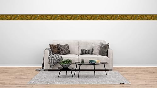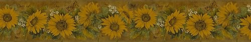 Dundee Deco DDAZBD9004 - Bordo adesivo per carta da parati, motivo floreale, giallo, senape, girasoli, farfalle, design retrò, 4,57 m x 17,78 cm, autoadesivo