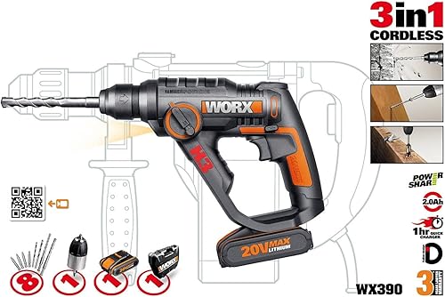 WORX WX390.1 H3 Martello Pneumatico, Trapano e Avvitatore 20V - 2 Batterie da 20V da 2,0Ah Li-Ion